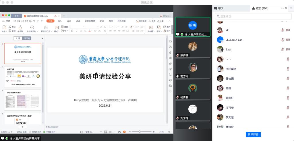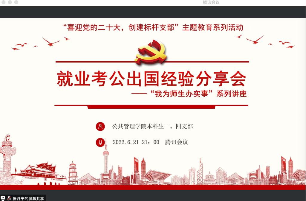 本科生一、四支部于线上举办了“喜迎党的二十大,创建标杆支部”主题教育系列活动之我为师生办实事:就业考公出国经验分享会。