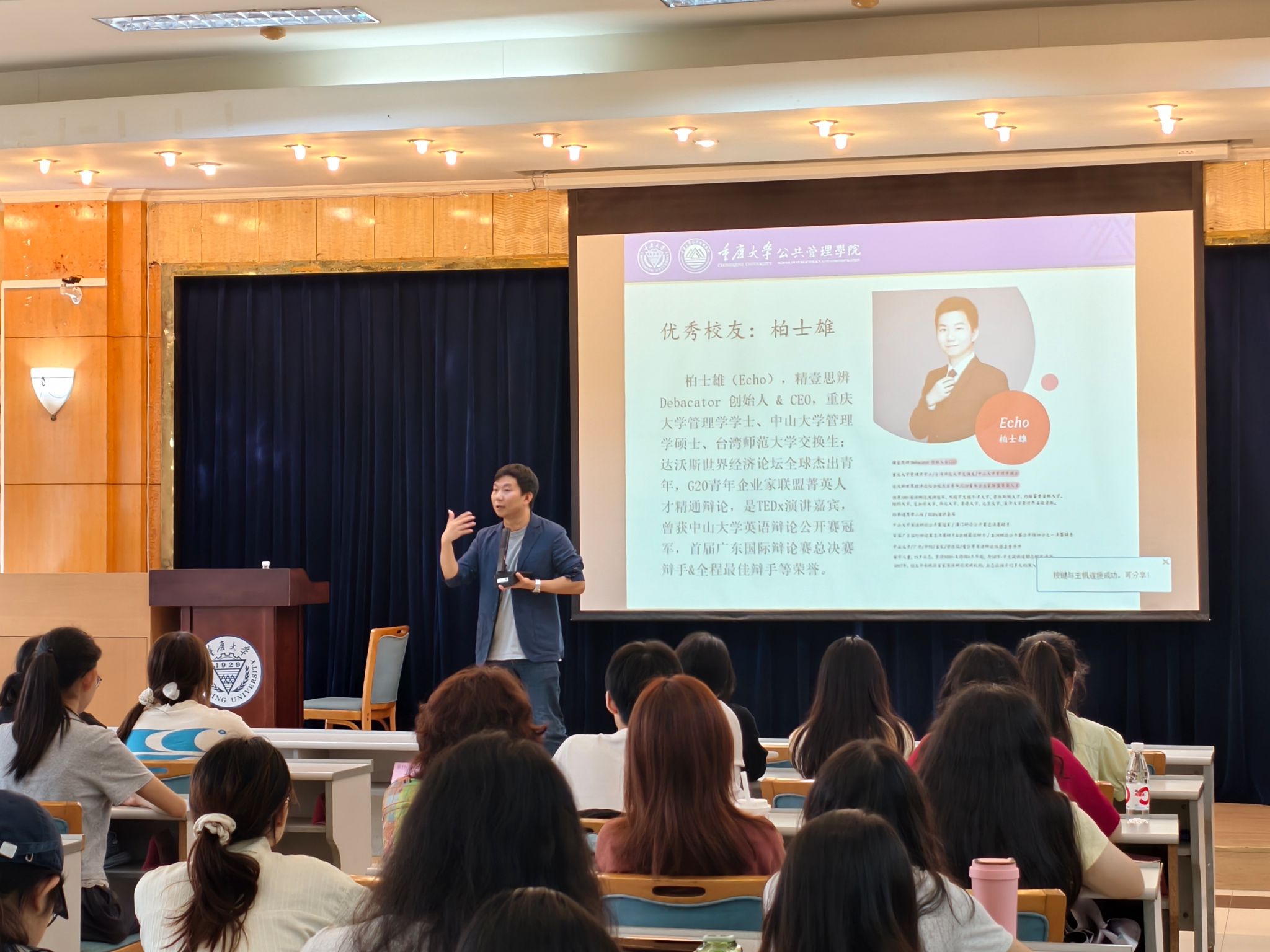 2015届本科毕业生、管理学学士,中山大学管理学硕士学位。获“达沃斯世界经济论坛全球杰出青年”、“G20青年企业家联盟菁英人才”等荣誉称号,担任TEDX演讲嘉宾。曾斩获中山大学英语辩论公开赛冠军,成为首届广东国际辩论赛总决赛辩手并获评全程最佳辩手,目前仍兼任中山大学等高校英语辩论社团名誉导师,其丰富的履历让现场学子充满期待。
