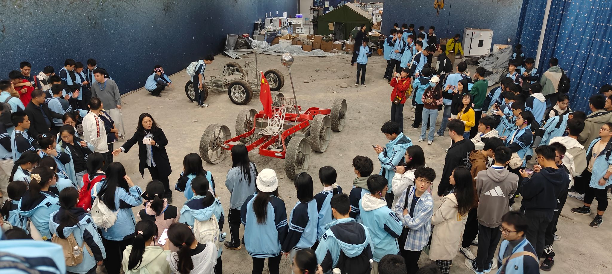教育部深空探测联合研究中心,深空探测中心杨老师全面介绍了四轮三轴月球车、端抱式月面巡视器转移释放机构、生物科普试验载荷等主要成果,并告诉同学们科学研究往往来源于生活,如端抱式月面巡视器转移释放机构就是模拟大人将小孩从高处抱下来的动作将月球探测车放置到月球背面,鼓励同学们多思考,多观察。初步激发在场师生对我国航天事业的热爱,增强了学生的民族自豪感!