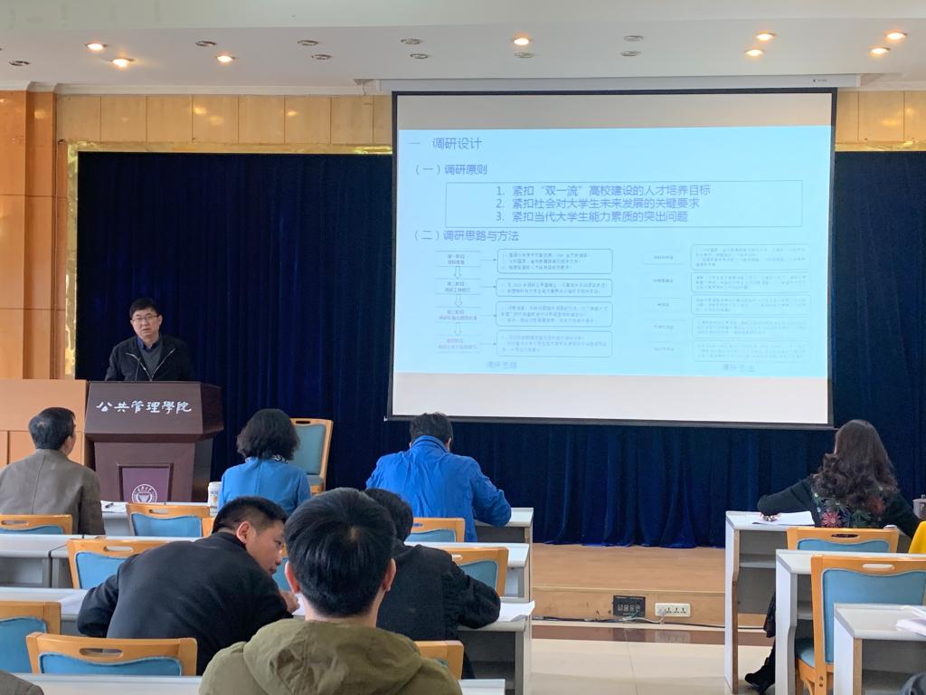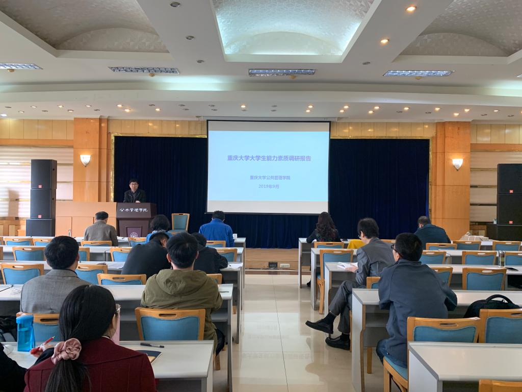 大学生能力素质调研报告”。全体教职员工参加会议。学院党委书记张玲主持会议。